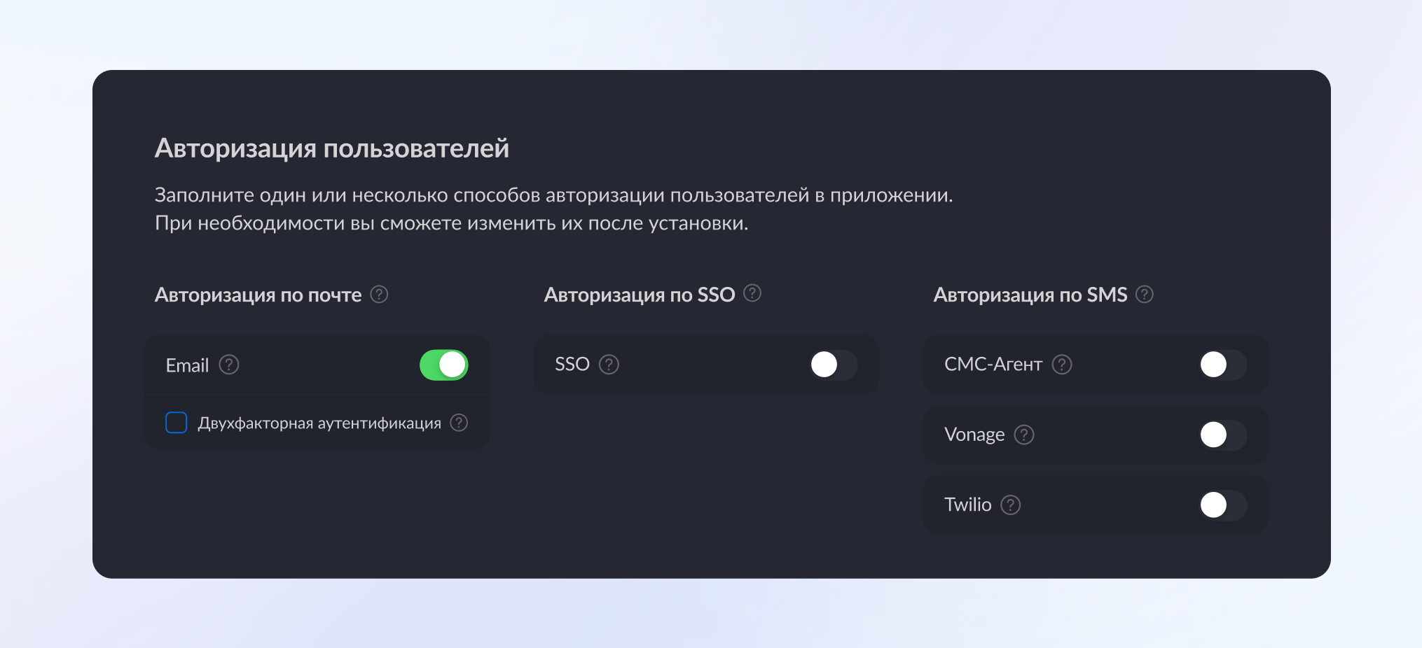При необходимости можно настроить любой поддерживаемый способ входа. Для работы достаточно настроить один способ.